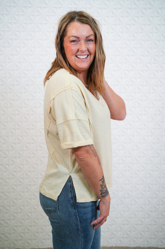 V Neck Knit Top - Raw Edge Side Slit - Cream