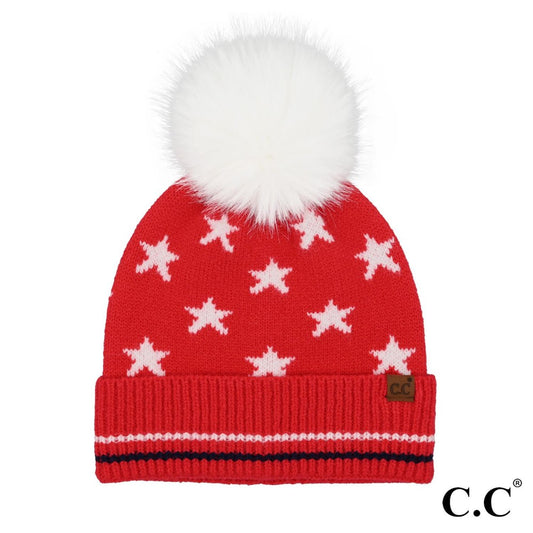 C.C - All Over Star And Stripe Cuff Pom Beanie