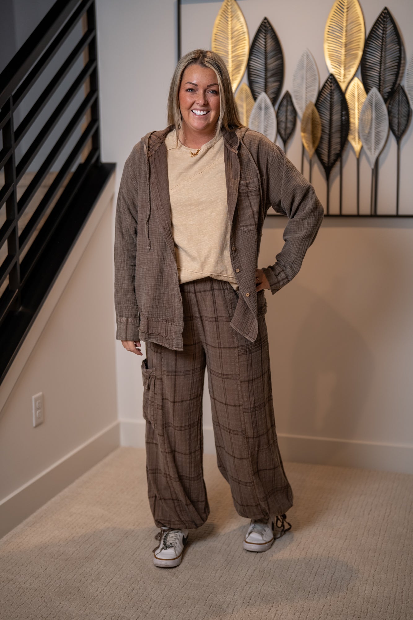 Easygoing with a touch of rustic charm, this Plaid Mineral Washed Hoodie is made for laid-back days and cozy layering. Crafted from lightweight, washed 100% cotton, it features a soft textured feel and relaxed fit with dropped shoulders for that perfectly lived-in look. The contrast plaid pattern adds effortless boho character, while the hooded button neckline, buttoned cuffs, and front chest pocket bring thoughtful detail.