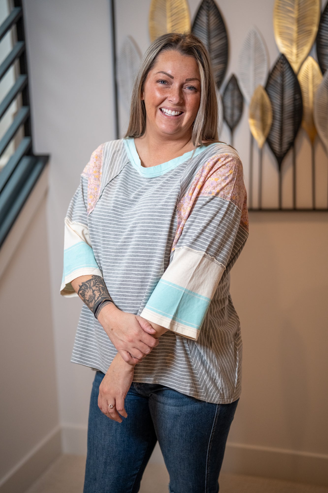 Easel Striped Floral Patchwork Top – Relaxed Boho Tee
