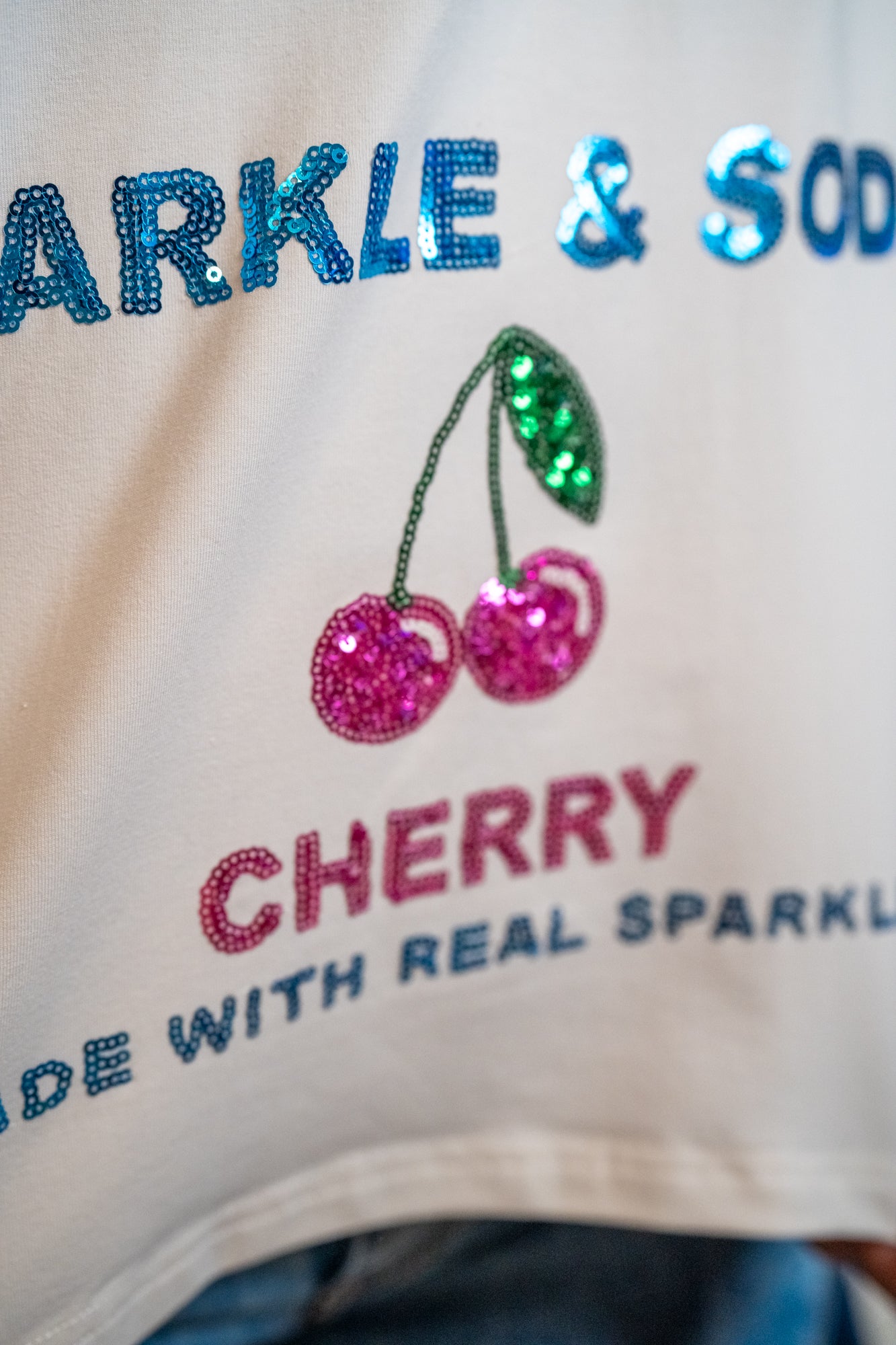 • Sequin “Sparkle & Soda” text with cherry detail