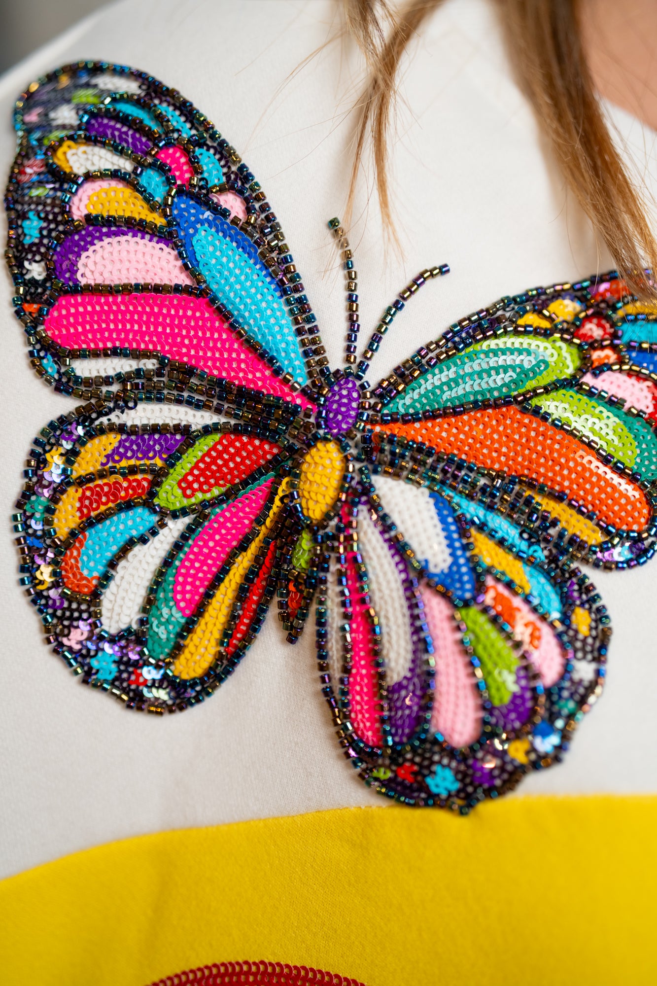 Bright, playful, and full of personality — this Queen of Sparkles Yellow & White Checkered Summer Icons Sweatshirt is a true statement piece. Designed with a bold checkered pattern, it features colorful, sequin-embroidered summer icons including butterflies, cherries, hearts, sunshine, ladybugs, and more.